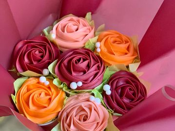 Our cupcake bouquets are guaranteed to bring a smile to your loved one's face! Cupcake flowers are made completely unique to each customer. Design and colors may vary slightly. We offer a price range for each bouquet. The lower end features simple but elegant flowers such as rosettes, tulips, hydrangeas, some greenery, and any other simple seasonal flowers. The higher end features flowers with more intricate designs such as roses, peonies, dahlias, daisies, etc.
